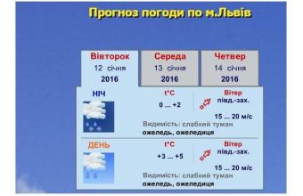 «Синоптики прогнозують сьогодні на Львівщині місцями пориви південно-західного вітру 15-20 метрів за секунду, ожеледь, подекуди сильні опади. Оголошено штормове попередження», – повідомили сьогодні, 12 січня, «Щоденному Львову» в прес-службі (відділі корпоративних зв’язків) ПАТ «Львівобленерго», де також поінформували: