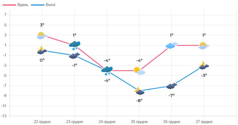 З вторгненням арктичного повітря спостерігатиметься поступове зниження температури вночі від 0 - 5° морозу до 6 - 11° морозу, вдень близько 0°.