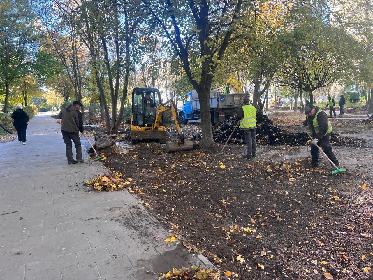Тут мостять безбарʼєрні хідники, розрівнюють ділянку під газон. Також прокладають футляри для електромереж та готують опори для освітлення.