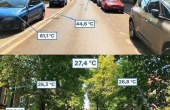 Якщо ж температура повітря становитиме аж 37,3℃, то дорожне покриття розігріється до 46,4℃. Смертельно небезпечна температура в автомобілях, припаркованих на вулиці без дерев, коливатиметься від 48℃ до 61,1℃ (!) А стіна будинку нагріється до 36,4℃.