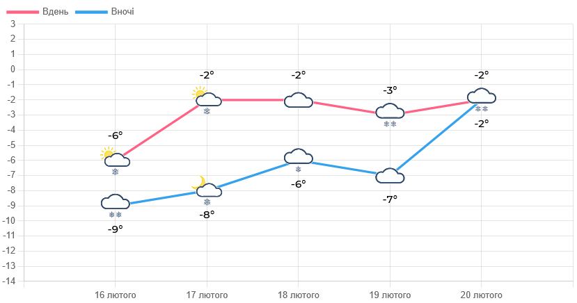 Температура: вночі -8...-10°C, вдень -1...-3°C.