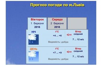 «Метеорологічна обстановка 1 березня: погода фактична – хмарно, місцями – невеликий дощ. подекуди – слабкий туман, вітер – південний-східний, 2-5 метрів за секунду, прогноз – хмарно, часом – дощ, місцями – сильний, вітер – східний, з переходом на південно-західний, 9-14 метрів за секунду, поривчастий. Температура повітря вдень – 5-10° тепла», – повідомили сьогодні, 1 березня, на сайті департаменту з питань цивільного захисту Львівської обласної державної адміністрації.