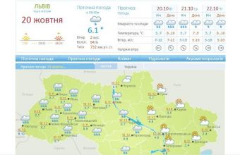 «Метеорологічна обстановка: 20 жовтня місцями сильні дощі. Погода: фактична –хмарна, дощ, вітер –північно-східний 5-7 метрів за секунду, температура повітря –5-7° тепла; прогноз – хмарна погода, часом – дощі, місцями – сильні, вітер –північно-східний, 7-12 метрів за секунду, температура повітря вдень –7-12° тепла», – повідомили сьогодні, 20 жовтня, на сайті департаменту з питань цивільного захисту Львівської обласної державної адміністрації.
