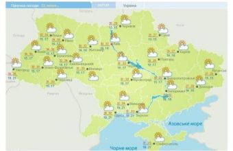 «Погода: фактична – мінлива хмарність, без опадів, вітер – західний, 2-5 метрів за секунду, температура повітря – 1 -19º тепла; прогноз – мінлива хмарність, без істотних опадів, увечері місцями – дощі, грози, град, вітер – південний, 7-12 метрів за секунду, під час грози – шквали 15-20 метрів за секунду, температура повітря вдень – 29-34º тепла».