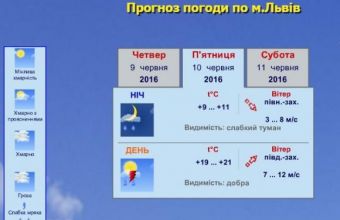«Львівський регіональний центр з гідрометеорології інформує, що завтра, 10 червня, у Львові – мінлива хмарність, вночі – місцями, а вдень – по всій території – короткочасні дощі, грози. Вдень подекуди – град. Вночі та вранці – слабкий туман. Вітер – південно-західний, вночі – 3-8 метрів за секунду, вдень – 7-12 метрів за секунду. Температура повітря вночі – 8-13° тепла, вдень – 18-23° тепла.