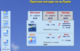 «Метеорологічна обстановка 21 червня: хмарно з проясненнями, місцями – короткочасні дощі, грози, вдень подекуди – град, вітер вдень північно-західний, 712 метрів за секунду, поривчастий, температура повітря вдень – 27-32° тепла», – повідомили сьогодні, 21 червня, на сайті департаменту з питань цивільного захисту Львівської обласної державної адміністрації. Натомість у прес-службі Львівської міської ради попередили: