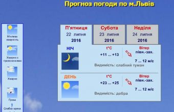 «Львівський регіональний центр з гідрометеорології інформує, що сьогодні зі збереженням до кінця доби, 22 липня, у Львові місцями – пориви північно-західного вітру 15-20 метрів за секунду. Завтра, 23 липня, – без істотних опадів, вночі та вранці – слабкий туман. Вітер – північно-західний, 7-12 метрів за секунду. Температура повітря вночі – 10-12° тепла, вдень – 26-28° тепла.