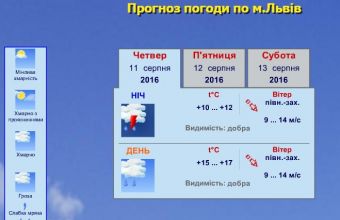 «Львівський регіональний центр з гідрометеорології інформує, що 11 серпня, у Львові часом – дощ, вночі – гроза. Вітер – північно-західний, 9-14 метрів за секунду, місцями – пориви вітру та шквали 15-22 метрів за секунду. Температура повітря вночі –10-12° тепла, вдень –15-17° тепла.
