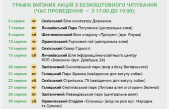 Графік виїзних акцій з безкоштовного чіпування (час проведення — з 17:00 до 19:00):