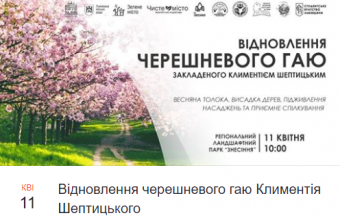 Про це повідомили в прес-службі Львівської міськради, де також розповіли: «Учасники акції матимуть змогу долучитися до прибирання території, а також підготувати та висадити саджанці черешні. Толока приурочена до 150-річчя з дня народження Климентія Шептицького.