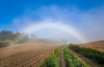 Ранок на початку жовтня поєднав у собі невеликий дощ, туман та сонце. Ці умови є ідеальними для того, щоб виникла незвичайна туманна дуга, яку ще називають білою веселкою.