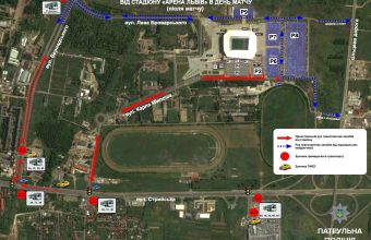 Доїзд на матч для приватного транспорту здійснюватиметься за такими схемами: вулиці Стрийська – Вернадського –Броварського – «Арена Львів», вулиці Стрийська – Сокільницька (поворот перед іподромом) – Міклоша – «Арена Львів». Також заїзд здійснюватиметься з кільцевої дороги. Виїзд зі стадіону після матчу відбуватиметься за маршрутами: «Арена Львів» – Броварського – Вернадського – Стрийська».
