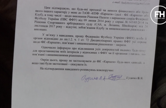 Колишній гравець «зелено-білих» Володимир Гудима підписав документ, в якому підтвердив, що не має ніяких претензій і вимог до них.