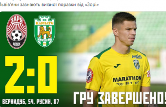Попри всі старання «Карпат» відігратись, другий гол у цій зустрічі забила також «Зоря». Кочергін віддав передачу на Русина, і той в падінні переправив шкіряного у сітку воріт Олега Кудрика – 2:0.
