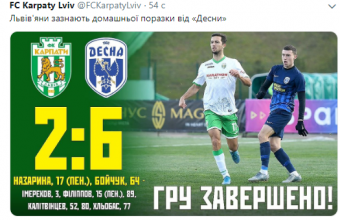 «Десна» перемогла «Карпати» у Львові з рахунком 6:2 у матчі 17-го туру чемпіонату України серед клубів прем’єр-ліги.