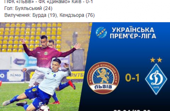 Футбольний клуб «Львів» програв київському «Динамо» з рахунком 0:1 у 26-му турі чемпіонату України серед команд прем’єр-ліги.