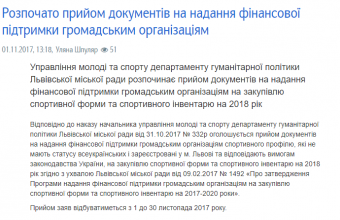 Про це повідомили сьогодні, 1 листопада, у Львівській міськраді, де також розповіли: «Відповідно до наказу начальника управління молоді та спорту департаменту гуманітарної політики Львівської міської ради №332р від 31 жовтня 2017року оголошується прийом документів на надання фінансової підтримки громадським організаціям спортивного профілю, які не мають статусу всеукраїнських і зареєстровані у Львові та відповідають вимогам законодавства України, на закупівлю спортивної форми та спортивного інвентарю на 2018 рік згідно з ухвалою Львівської міської ради №1492 «Про затвердження Програми надання фінансової підтримки громадським організаціям на закупівлю спортивної форми та спортивного інвентарю на 2017-2020 роки» від 9 лютого 2017 року. Прийом заяв відбуватиметься з 1 до 30 листопада 2017 року».