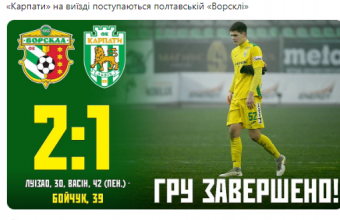 Полтавська «Ворскла» перемогла львівські «Карпати» у 18-му турі чемпіонату України з футболу серед клубів прем’єр-ліги з рахунком 2:1.