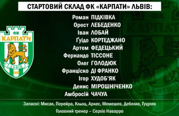 «Карпати»: Підківка, Лебеденко, Лобай, Кортеджано, Федецький, Тіссоне (Аркес, 51), Голодюк (Кльоц, 68), Ді Франко, Худоб’як, Мірошніченко, Чачуа (Гуцуляк, 82).