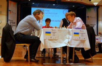 На цій світлині Василь Іванчук та Юрій Криворучко – суперники, натомість у Вірменії вони були партнерами по збірній України