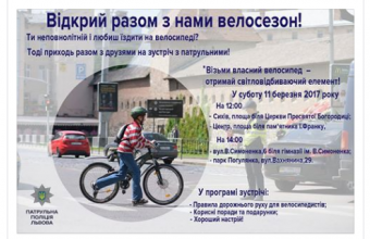 В управлінні патрульної поліції Львова повідомили сьогодні, що її працівники організовуватимуть у суботу, 11 березня, відкриття велосезону. Відтак, пропонують підліткам долучитися до відкриття разом з їхніми велосипедами в чотирьох локаціях: о 12:00 – на площі біля Церкви Пресвятої Богородиці в Сихівському районі Львова й площі біля пам’ятника Івану Франку на вулиці Університеській, а о 14:00 – біля гімназії імені Василя Симоненка на вулиці Симоненка та в парку «Погулянка» на вулиці Вахнянина.
