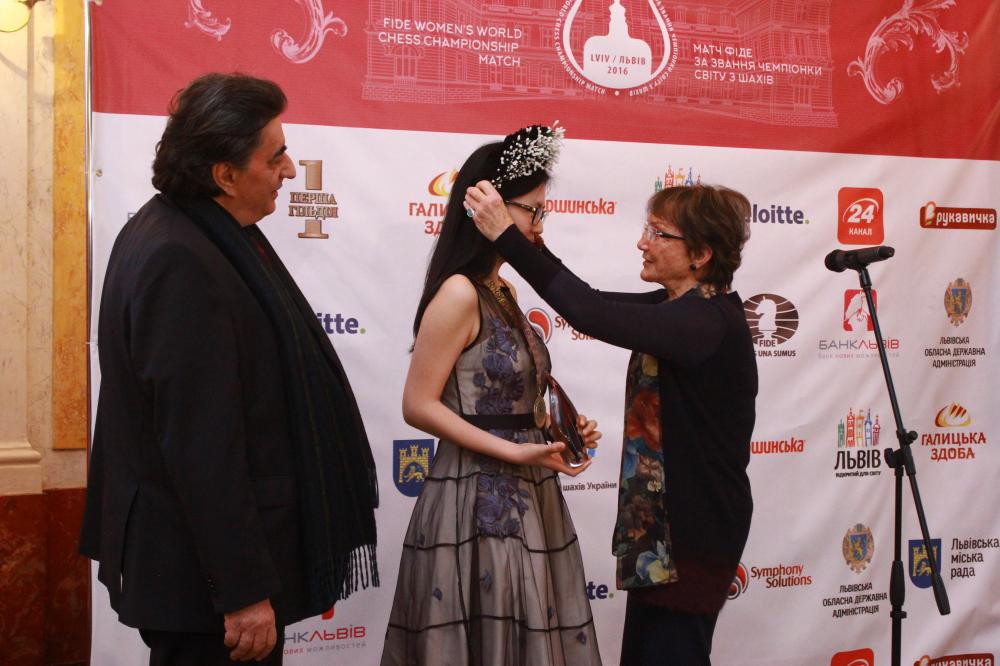 Чемпіонці китаянці Хоу Іфань вручили статуетку, спеціальний вінок, який виготовила майстриня Домініка Дика з майстерні «Треті півні», медаль та квіти. Особливий подарунок переможниці чемпіонату зробив міський голова Львова Андрій Садовий – картину з бурштину, на якій зображено Оперний театр, де власне і відбувалось відкриття чемпіонату світу з шахів серед жінок.