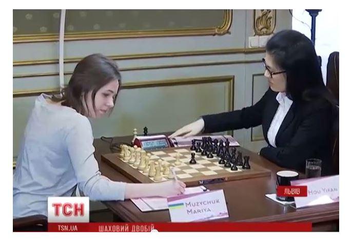 «У Львові триває перша партія чемпіонату світу з шахів серед жінок. Змагання такого рівня Україна приймає уперше за часів Незалежності. До палацу Потоцьких, де триває двобій, шахістки приїхали на іменних автівках. Перед поєдинком усіх, в тому числі спортсменок, обшукали за допомогою металодетектора», – повідомили сьогодні, 2 березня, в «Телевізійній службі новин» каналу «1+1».