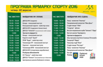 Цьогоріч на «Ярмарку» свої види спорту представлять понад 70 спортивних організацій Львова. Взяти участь у заході зможуть усі охочі – незалежно від віку. Співорганізатор «Ярмарку спорту», координатор громадської організації «Здорове місто» Олег Чунис, розповів: «Як і в попередні роки, намагатимемося вражати гостей новинками, серед яких: лазертаг, бейсбол, корфбол, хортинг, кендо. Також вперше матиме можливість виступити на «Ярмарку спорту» львівський цирк, який готує талановитих акробатів та гімнастів. Можна буде поїздити верхи та потримати у руках лицарське спорядження».