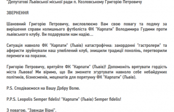 "Спортивка" на своїй сторінці у Фейсбуці опублікувала таке звернення від "завжди вірних" фанатів "Карпат" до депутата Львівської міської ради Григорія Козловського.