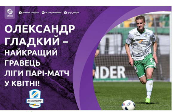 За результатами голосування у проекті, організованому Українською Прем’єр-лігою і ТМ «Parimatch», переможцем став нападник «Карпат» Олександр Гладкий, визнаний уболівальниками кращим гравцем Ліги Парі-Матч у квітні. У голосуванні брали участь переможці номінації «Кращий гравець туру» (у квітні: 23 тур – Андрій Ярмоленко («Динамо»), 24 тур – Еліас («Чорноморець»), 25 тур – Денис Гармаш («Чорноморець»), 26 тур – Дмитро Коркішко («Чорноморець»), 27 тур – Андрій Ярмоленко («Динамо»), а також гравці, які, на думку нашої експертної ради, відзначалися стабільністю впродовж п’яти турів і заслужили право взяти участь у голосуванні: Тайсон («Шахта»), Олександр Гладкий («Карпати»), Факундо Феррейра («Шахтар»), Андрій Лунін («Дніпро»).