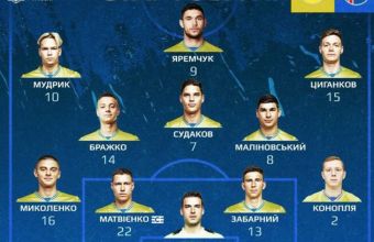 Україна: Лунін – Миколенко, Матвієнко, Забарний, Конопля – Бражко, Судаков, Маліновський – Мудрик, Циганков, Яремчук.