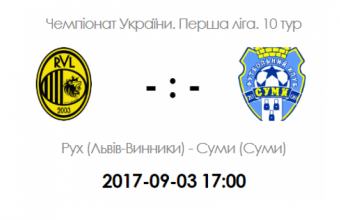 Матч десятого туру чемпіонату України в першій лізі між «Рухом» і ФК«Суми» розпочнеться на стадіоні імені Богдана Маркевича на вулиці Спортовій у Винниках в неділю, 3 вересня, о 17.00.