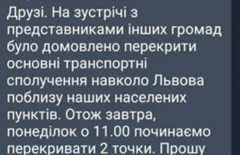 «На зустрічі з представниками інших громад було домовлено перекрити основні транспортні сполучення навколо Львова поблизу наших населених пунктів. Отож завтра, у понеділок, о 11:00 починаємо перекривати дві точки. Прошу максимально мобілізуватися», – повідомлення такого змісту з’явилося у неділю, 31 травня, в одній із локальних груп у месенджері Viber, повідомляє ZAXID.NET.