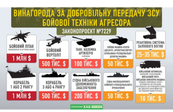 Винагорода за малогабаритні судна, бойову машину піхоти, бронетранспортер становитиме 50 тисяч доларів.