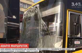 «12 людей травмувалися через зіткнення двох маршруток у Львові. Аварія трапилася вранці біля зупинки. В салонах обох автобусів у той час було півсотні пасажирів», – повідомила «Телевізійна служба новин» каналу «1+1».