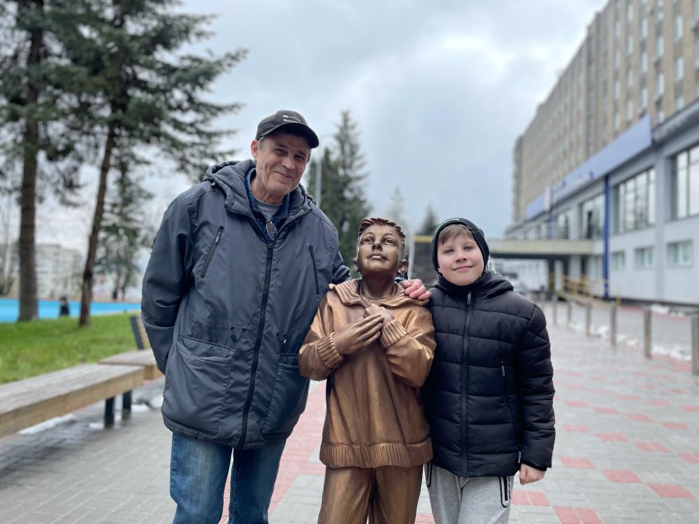 Натхненник скульптурної композиції – Тимофій Чернишков разом із батьком Олександром також приїхали на відкриття монументу. Пацієнта уже виписали з лікарі. Нині вони живуть неподалік Львова. Хлопчик каже: скульптура – дуже на нього схожа. Батько хлопця заледве стримує емоції.