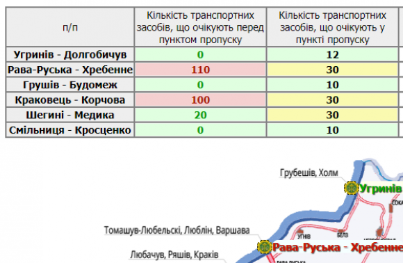 110 водіїв очікують перед пунктом пропуску в Рава-Руській, а 100 – у Краковці.