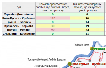 120 водіїв транспортних засобів очікують у четвер, 22 лютого, в прикордонному пункті пропуску в Рава-Руській, а 90 – в Шегинях.