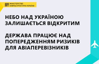 Небо над Україною залишається відкритим, держава працює над попередженням ризиків для авіаперевізників. Про це заявило Міністерство інфраструктури України, пише Dailylviv.com.