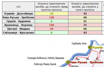 150 транспортних засобів очікували вранці в середу, 15 листопада, перед пунктом пропуску в Краковці, 120 – в Рава-Руській, а 70 – в Шегинях.