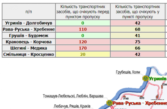 170 водіїв очікують перед пунктом пропуску в Шегинях, 120 – у Краковці, а 110 – у Рава-Руській.