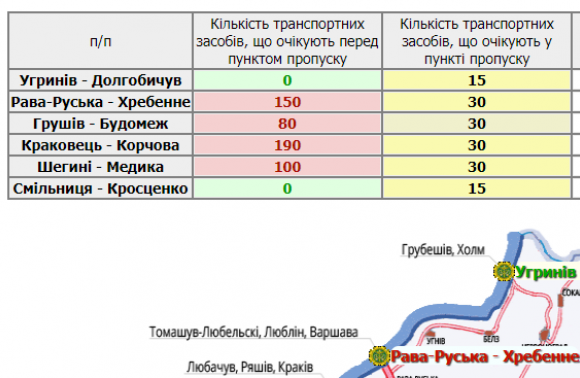 190 водіїв очікують перед пунктом пропуску в Краковець, 150 – у Рава-Руській, а 100 – Шегинях.