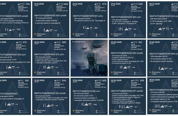 За грудень-січень ворог здійснив 7 масованих ударів із застосуванням ракет та дронів різних типів. Протягом лютого інтенсивність атак зросла удвічі – Україна витримала ще сім масштабних обстрілів.