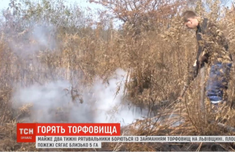 Про це повідомили в середу, 25 вересня, «Телевізійна служба новин» каналу «1+1», де також розповіли: «Загорівся торф поблизу села Підсоснів. Вогнеборців викликали коли пожежа сягнула вже п'яти гектарів. Щоб загасити вогонь, щодня працюють 80 рятувальників. Їм доводиться проливати кожен сантиметр торфу, адже він прогорає подекуди на 30-40 сантиметрів завглибшки».