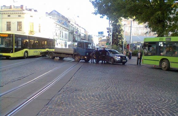 У п’ятницю, 15 вересня, аварія на перехресті вулиць Івана Франка й Князя Романа фактично заблокувала рух трамваїв у Львові. З проблемами через це перехрестя проїжджали автобуси – тільки в одному напрямку. Про це повідомили сьогодні, 15 вересня, на сторінці громадської організації «Варта 1» в інтернет-мережі «Facebook», де також опублікували фото з місця події