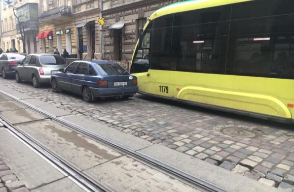 Трамваї стоять на вулицях Дорошенка й Словацького через порушення правил паркування.
