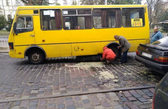 Паливний бак відпав від маршрутного автобуса №43 навпроти головного корпусу «Львівської політехніки» на вулиці Бандери.