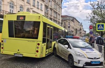 Маршрутний автобус №45 скоїв у неділю, 12 травня, близько 16:35 на площі Соборній у Львові зіткнення припаркованим з автомобілем патрульних.