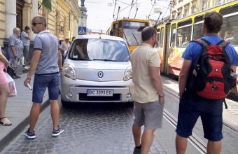 Припарований впритул до колії легковик змушує простоювати трамваї на початку вулиці Личаківської
