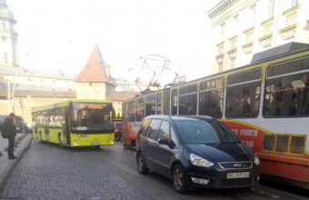 Трамваї стоять на вулиці Личаківській через залишений на колії автомобіль.